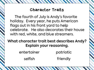 The document presents various scenarios illustrating different character traits of individuals named Antonio, Andy, Raj, and Kay, each demonstrating traits like clumsiness, patriotism, thoughtlessness, and generosity respectively. It also includes prompts for personal reflection on character traits and a list of related traits ranked by humor. Additionally, the document offers resources for character trait activities.