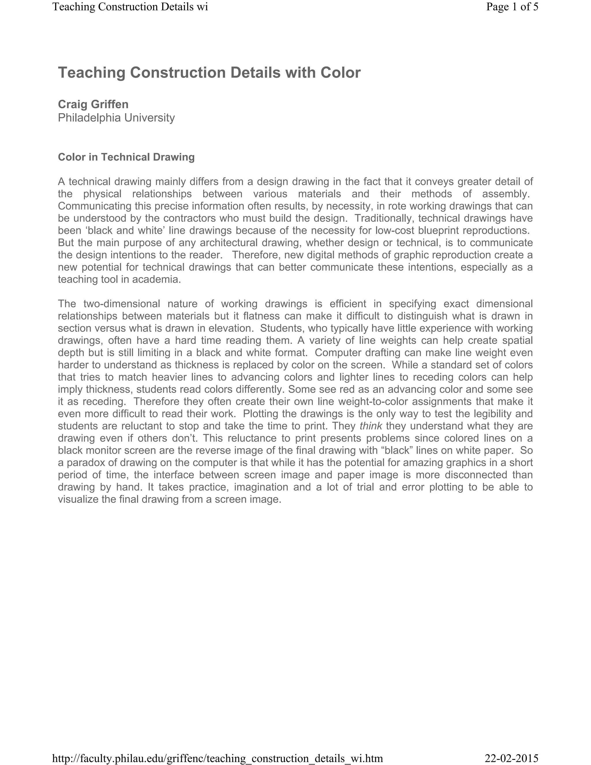 1) The document discusses using color in technical drawings to better teach construction details to students. While technical drawings were traditionally black and white, digital tools now allow for color renderings.