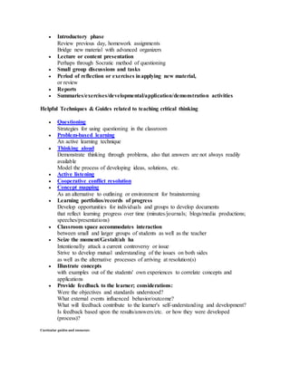 Critical thinking involves discovery, analysis, synthesis and evaluation of information. It reflects Bloom's taxonomy of cognitive objectives and involves understanding patterns and applying different types of intelligence. Teaching critical thinking includes introducing new concepts based on prior knowledge, having clear goals and standards, integrating generalization, and making internalization of knowledge a goal. A typical class involves reviewing previous material, presenting new content through lecture or questioning, small group work, reflection and exercises to apply new concepts.