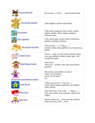 This document provides English lesson plans and activities for teaching English to young learners. The lessons introduce basic greetings like "What's your name?" and "How are you?" as well as numbers, foods, animals, family members and parts of the body. The lessons aim to get students using simple English through fun activities like naming foods they like, describing weather, acting out animal sounds and drawing faces. The lessons build students' vocabulary and conversational skills in a playful, engaging manner.