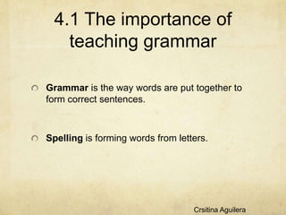 This document discusses teaching grammar and language as a system. It covers the importance of teaching grammar, factors involved like learner attributes and teaching approaches. It identifies problems areas like teaching grammar without context and provides alternatives like PACE and whole language teaching. The conclusion emphasizes designing cognitively demanding activities that encourage learners to actively participate in the learning process through hypothesizing, predicting, and self-correcting.