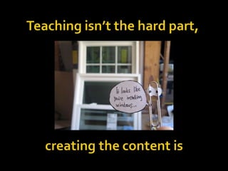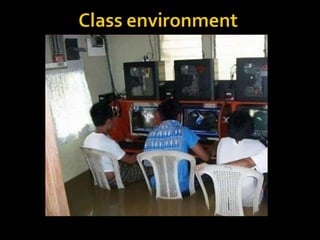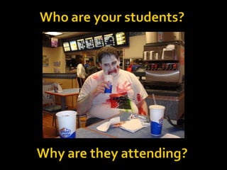 The document discusses using distraction as a technique for dealing with planned issues in a computer lab. It recommends talking to students rather than lecturing them, assuming nothing about their experiences, using metaphors and positive reinforcement when working with learners.