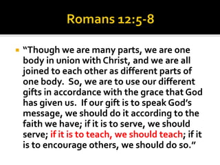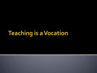 The document discusses the role and responsibilities of teachers. It says that teaching is a vocation and gift from God, not just a job. Teachers are called to share in Jesus' ministry of teaching and to form the whole person, not just impart information. While they impart knowledge, teachers must point students toward the ultimate Source of knowledge, which is God. The document emphasizes that teachers are servants and stewards of the gifts entrusted to them, to develop and share for the good of the community.