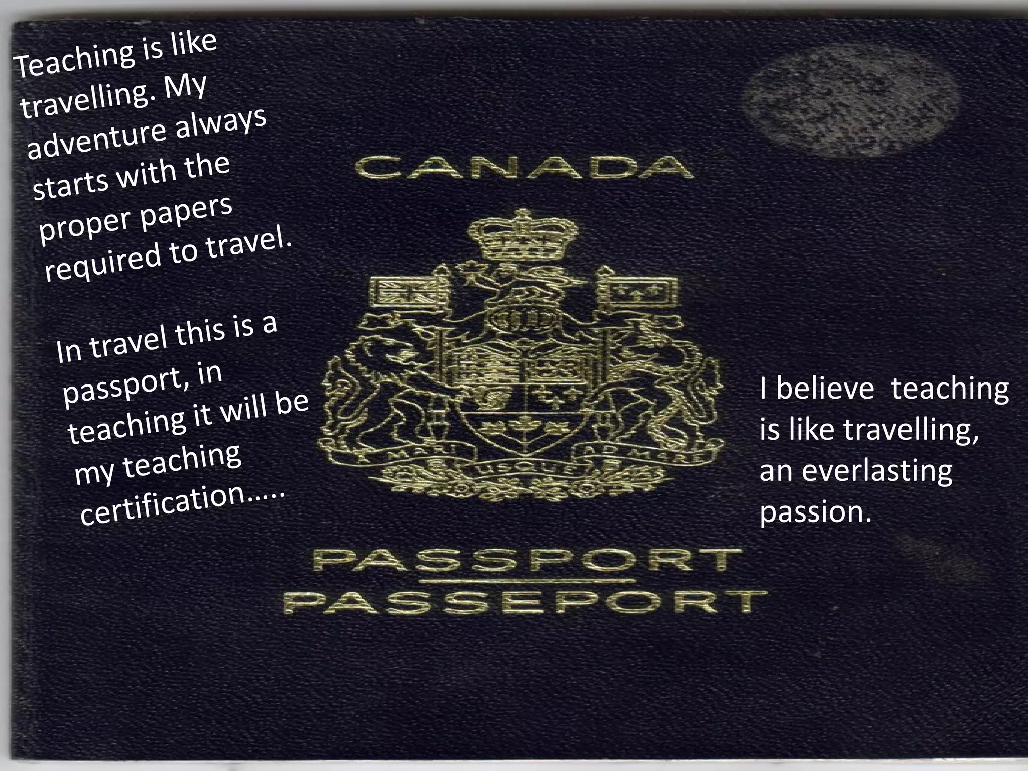 The author believes that teaching is like traveling in that it is a lifelong journey and passion. With a teaching degree, the author will be able to teach students across Canada and even overseas, just as traveling allows one to visit different places. Both teaching and traveling involve meeting diverse people and learning from students and travel companions along the way. While there may be challenges, the journey is worth it to help students grow and see their accomplishments, just as traveling is worth it to reach new destinations and learn new things.