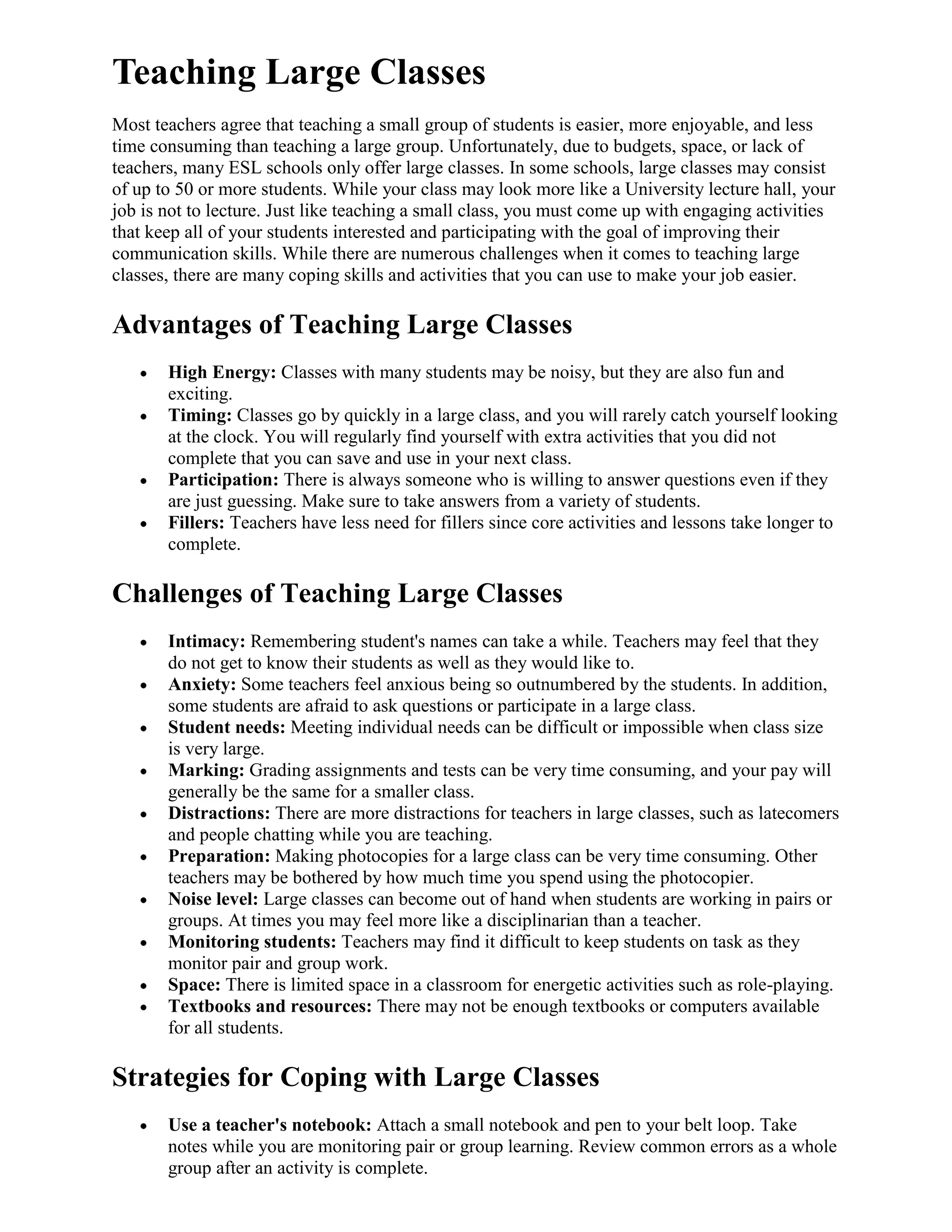 The document discusses the advantages and challenges of teaching both large and small English language classes, noting that while small classes allow for more individualized attention, large classes come with their own benefits like high energy and always having students willing to participate; it provides strategies for managing large classes, such as using a teacher's notebook, encouraging competition between groups, and designing activities like small group discussions.