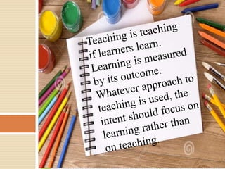 This document outlines key points for effective teaching-learning in an Outcomes-Based Education model. It states that teachers must adequately prepare students, create a positive learning environment, help students understand what they are learning and why. Teachers should also use a variety of teaching methods, provide opportunities for students to apply their new knowledge and skills, and help students understand what they have learned. The document contrasts traditional instruction-focused education with OBE, noting OBE focuses on learning outcomes, knowledge existing within learners, and teachers designing learning methods in collaboration with students.