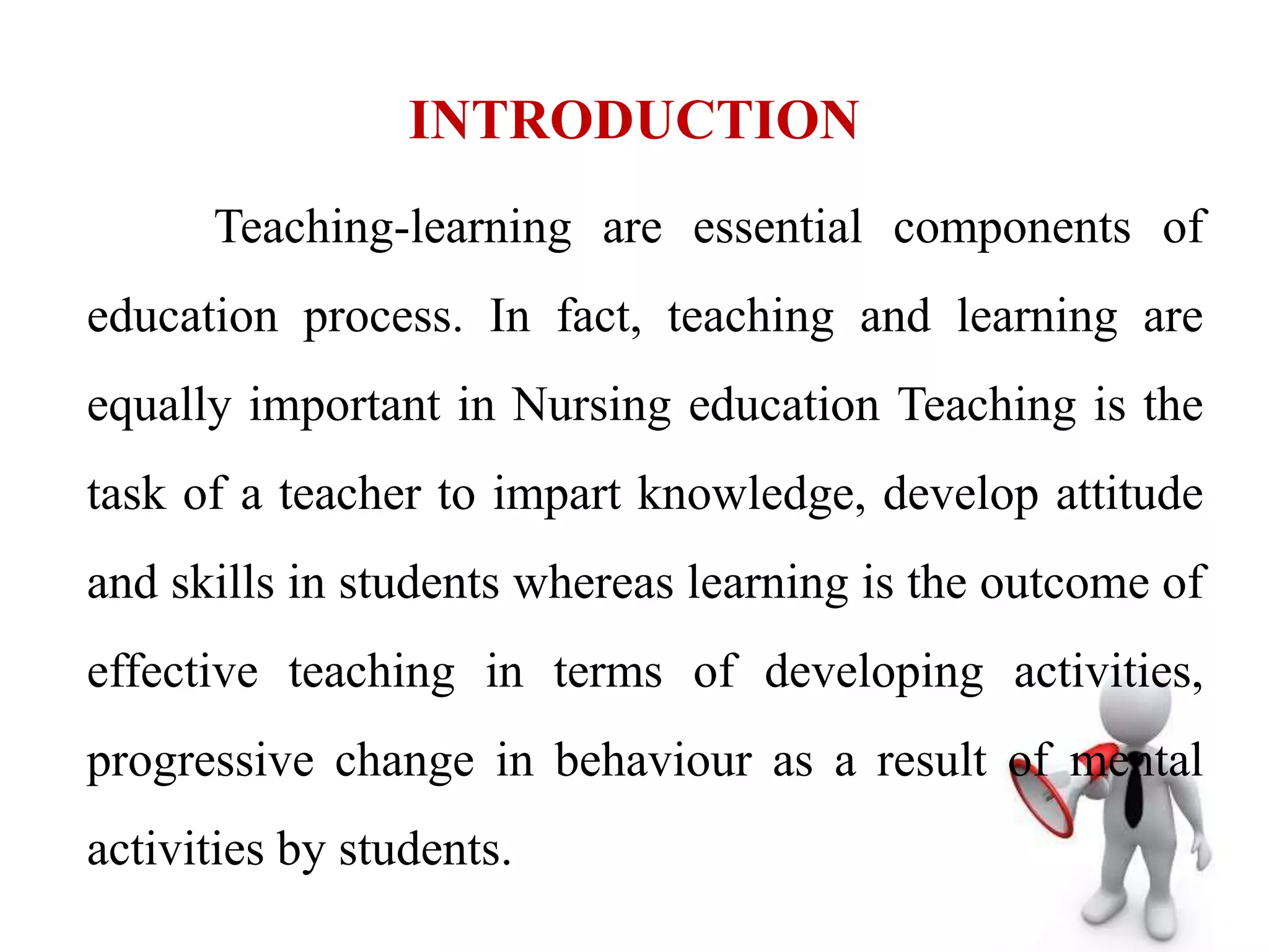 The document discusses the essential components of the teaching-learning process in nursing education, emphasizing the roles of teaching, learning, and effective communication. It outlines the principles and elements that foster a productive educational environment, including teacher and learner dynamics, learning materials, methods, and the significance of feedback and practice. Additionally, it highlights the nurse's responsibility to educate patients across various health topics to ensure proper care and recovery post-hospitalization.