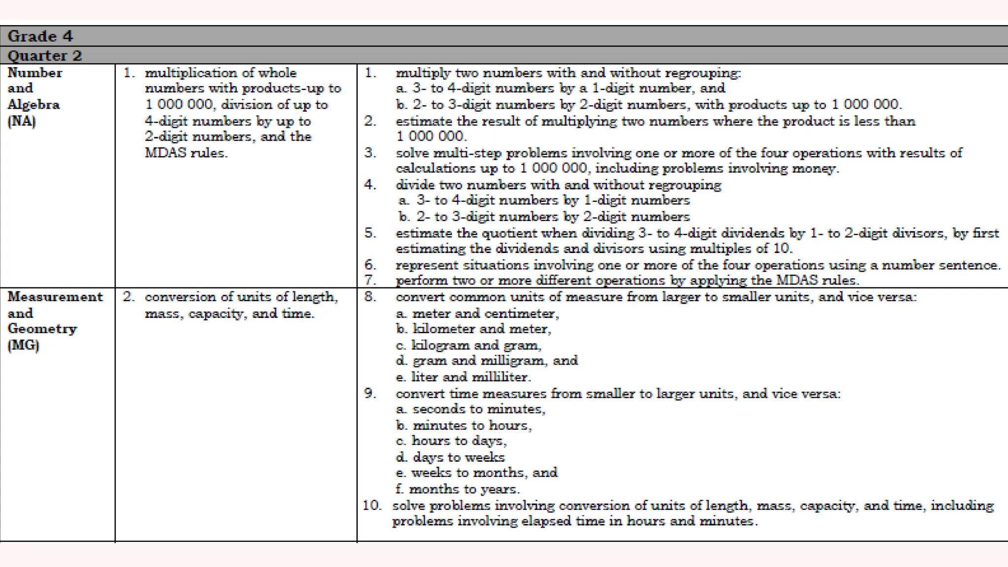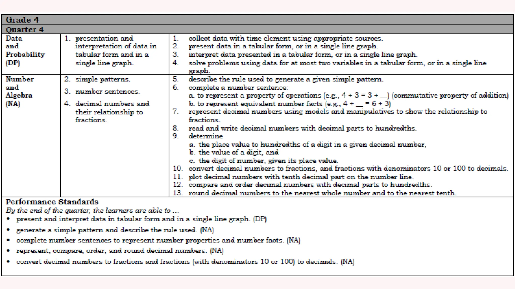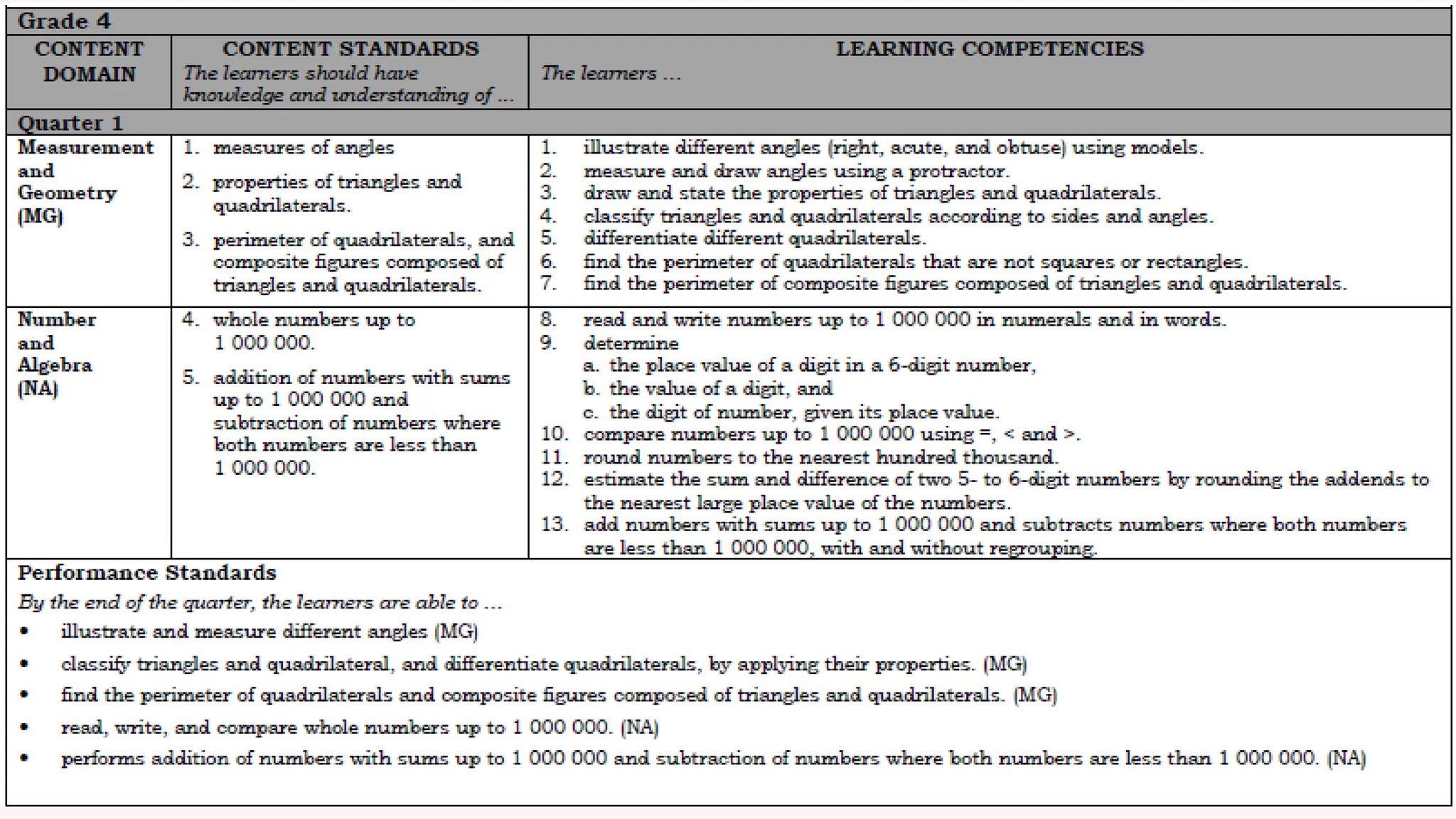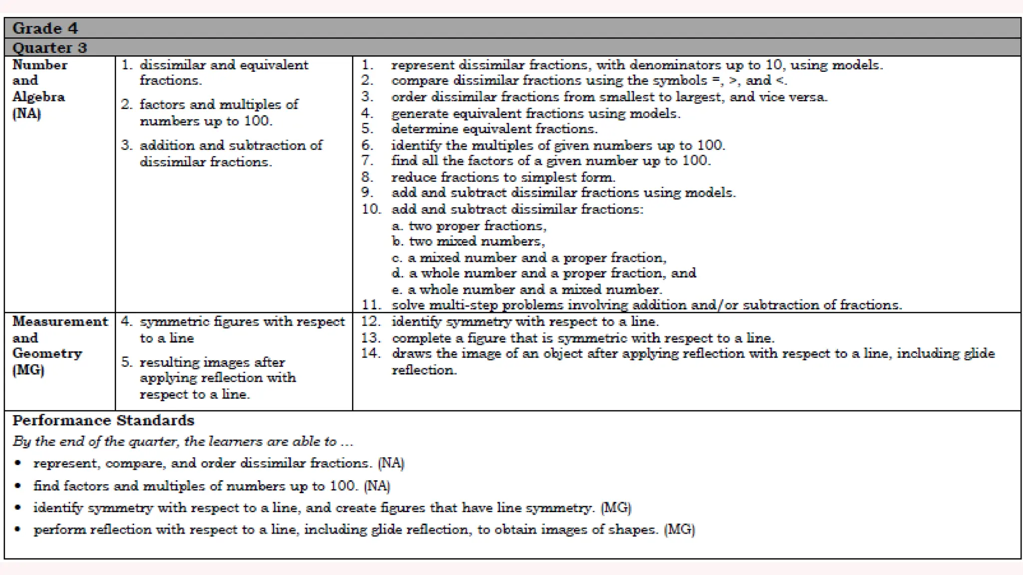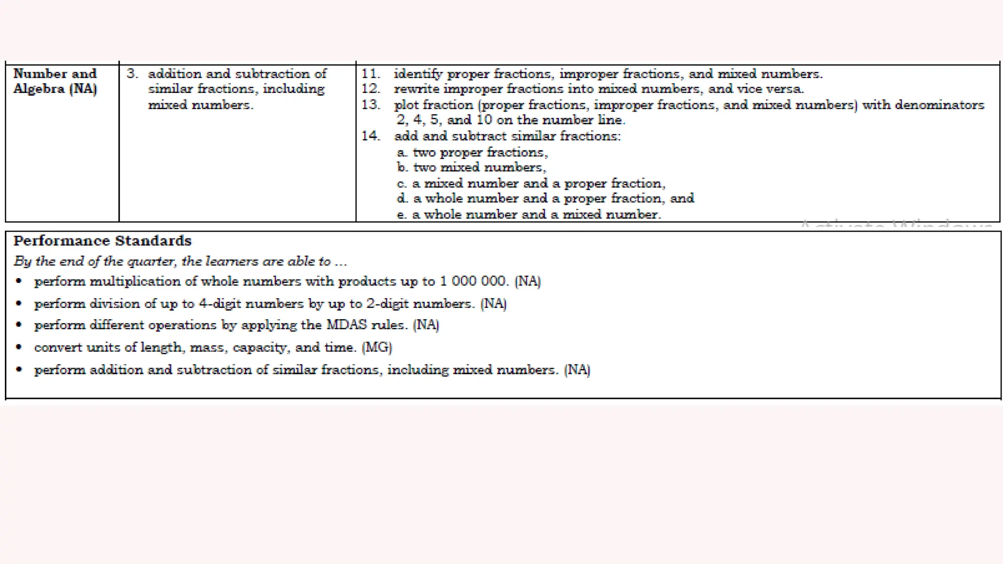 numbers and their relationship to fractions); Measurement and Geometry (right, acute, and obtuse