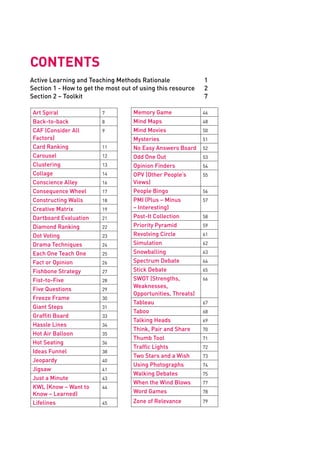 This document provides an overview of active learning and teaching methods. It contains two main sections. Section 1 discusses how to effectively use the resource, including considering teacher and pupil motivation, classroom dynamics, preparedness, and the teacher's changing role from transmitter to facilitator. Section 2 contains the toolkit of over 40 specific active learning strategies like back-to-back, CAF, card ranking, and more. Each strategy outlines its purpose and how to implement it in the classroom.