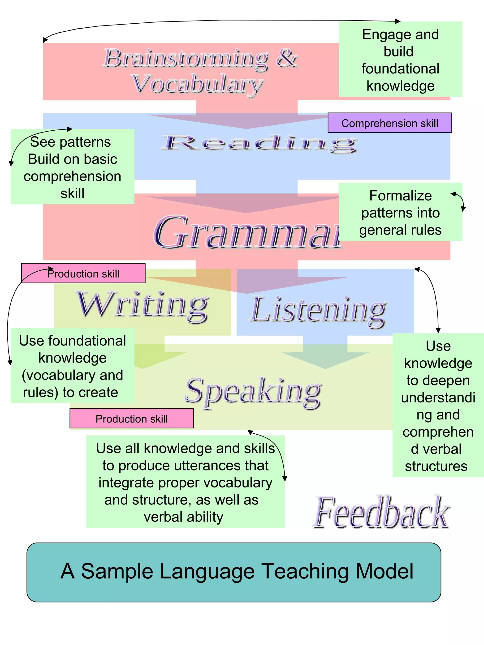 The document outlines a sample language teaching model that incorporates various skills and activities. It discusses developing foundational knowledge through vocabulary and grammar exercises before building comprehension, production, and feedback skills. A range of activities are proposed for different skills, such as reading tasks, grammar drills, writing assignments, listening exercises, and speaking practices. Formative assessment with feedback is emphasized to continuously improve students' language abilities.