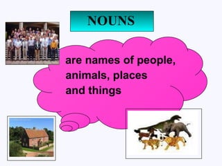 The document provides examples of teaching nouns to students. It defines different types of nouns such as proper nouns, common nouns, countable nouns, uncountable nouns, singular nouns, and plural nouns. Examples are given for each type of noun to illustrate their meanings and usage. Exercises are also included for students to identify and classify different nouns.