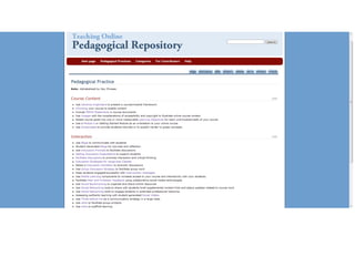 The Teaching Online Pedagogical Repository (TOPR) is an open-source faculty development resource that curates effective teaching practices for online and blended courses. It allows individual entries that describe strategies, provide artifacts from actual courses, and cite relevant research. TOPR is built on a wiki platform to enable easy collaboration and editing. It aims to document good teaching practices beyond just materials or models. The document outlines TOPR's goals, development process, and ways for others to get involved through contributing entries or becoming peer reviewers.