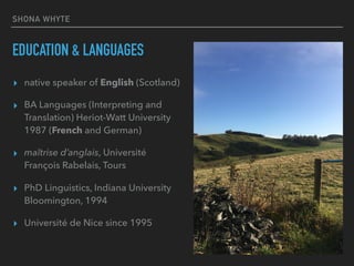 This document provides a summary of Shona Whyte's background and areas of teaching and research. It indicates that Shona Whyte is a native English speaker from Scotland who holds a BA in Languages from Heriot-Watt University and a PhD in Linguistics from Indiana University. Her areas of teaching include oral English, translation, applied linguistics, language teacher education, and English for Specific Purposes. Her research focuses on interactions in second language classrooms, Computer-Assisted Language Learning, English for vocational studies, and open educational resources.