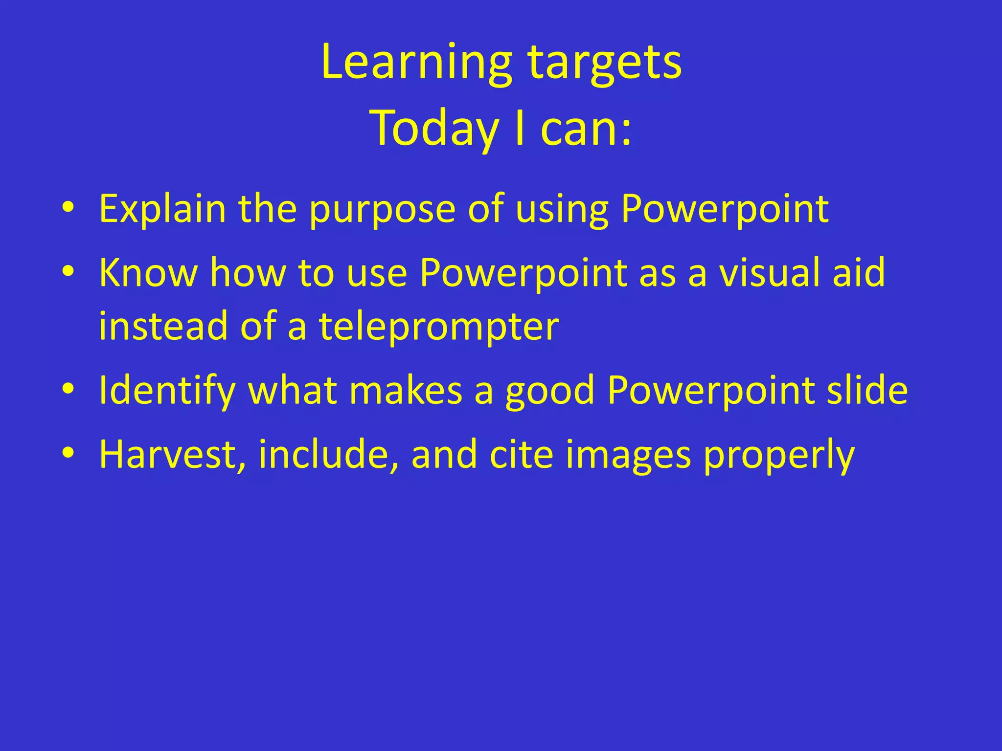 The document outlines learning targets for a PowerPoint presentation which include explaining the purpose of using PowerPoint, how to use it as a visual aid instead of just reading slides, and what makes a good PowerPoint slide. It provides tips for using PowerPoint such as focusing on the audience not the screen, reducing words and using images and graphics while giving them credit, and using easy to read fonts with limiting effects and transitions. The document provides guidance on creating effective PowerPoint presentations.