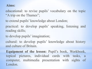 The lesson aims to revise vocabulary about a trip on the Thames and enhance knowledge about London. Students engaged in various activities including multimedia presentations, discussions on London sights, and exercises on adjectives. The lesson concluded with a home task to write sentences about London sights for a new student.