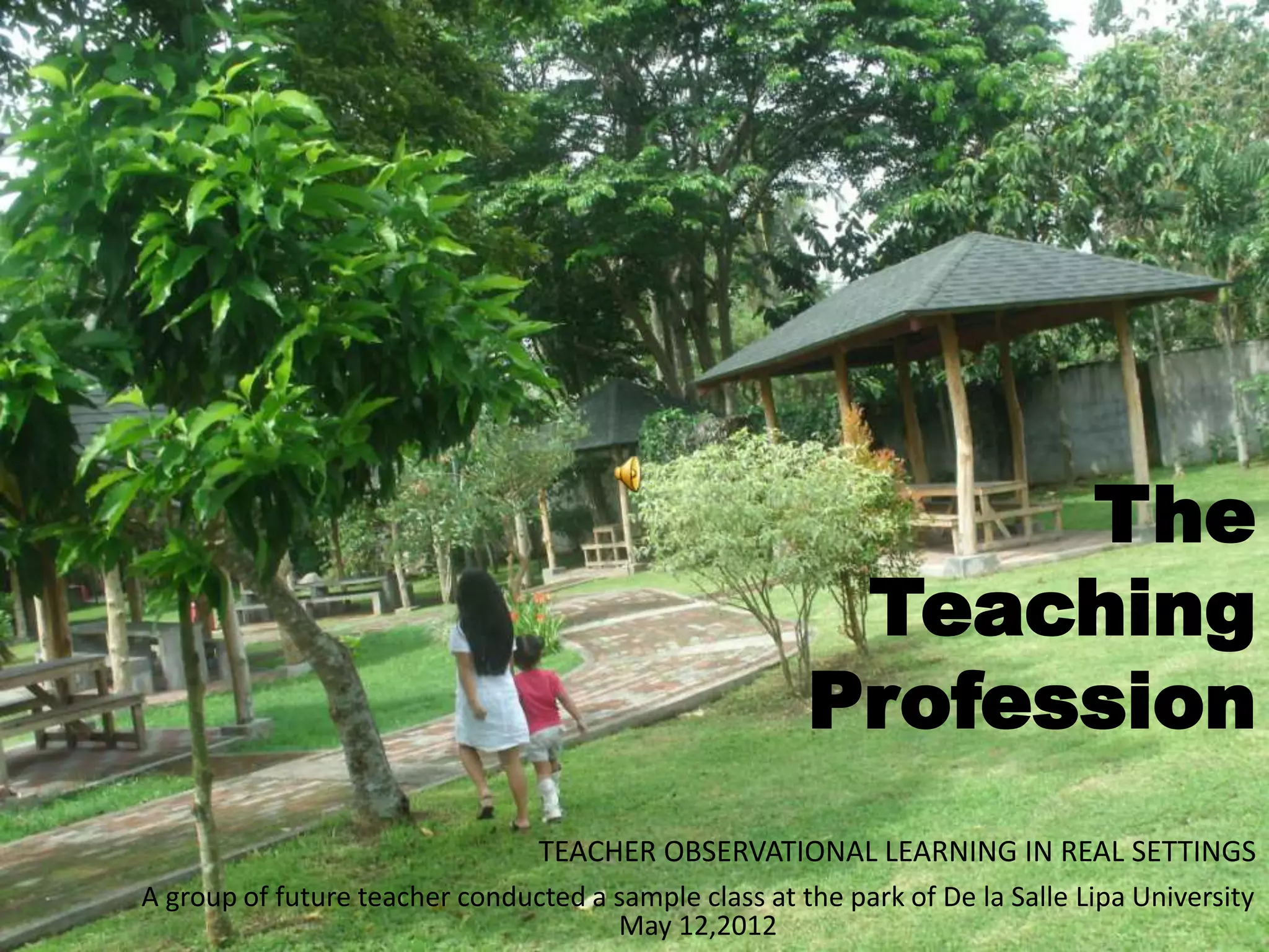 A group of future teachers conducted a sample class at De La Salle Lipa University to gain observational experience teaching in real settings. To be an effective teacher requires having patience, compassion, concern for others, and respect while creating an environment conducive to learning. Effective teaching strategies depend on the subject matter and tailoring the approach based on students' abilities and interests while focusing on helping students learn to know, do, live together, and be.