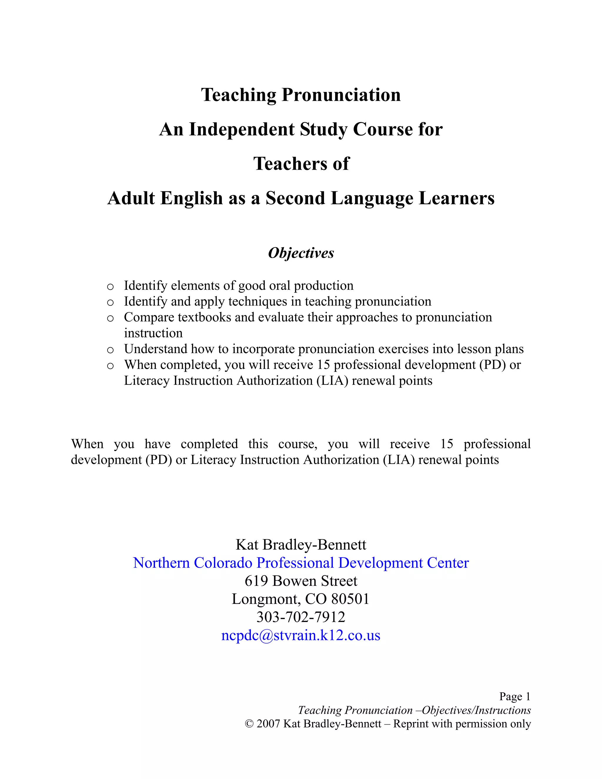 This document provides an introduction to an independent study course on teaching pronunciation to adult English language learners. The objectives of the course are to identify elements of good oral production, techniques for teaching pronunciation, evaluate pronunciation in textbooks, incorporate pronunciation exercises into lesson plans, and complete application activities. Upon completion, participants will receive 15 professional development points. The course is intended for teachers of adult ESL students and is estimated to take 11-15 hours to complete. It covers theory, best practices, and application activities to improve participants' ability to teach pronunciation in the classroom.