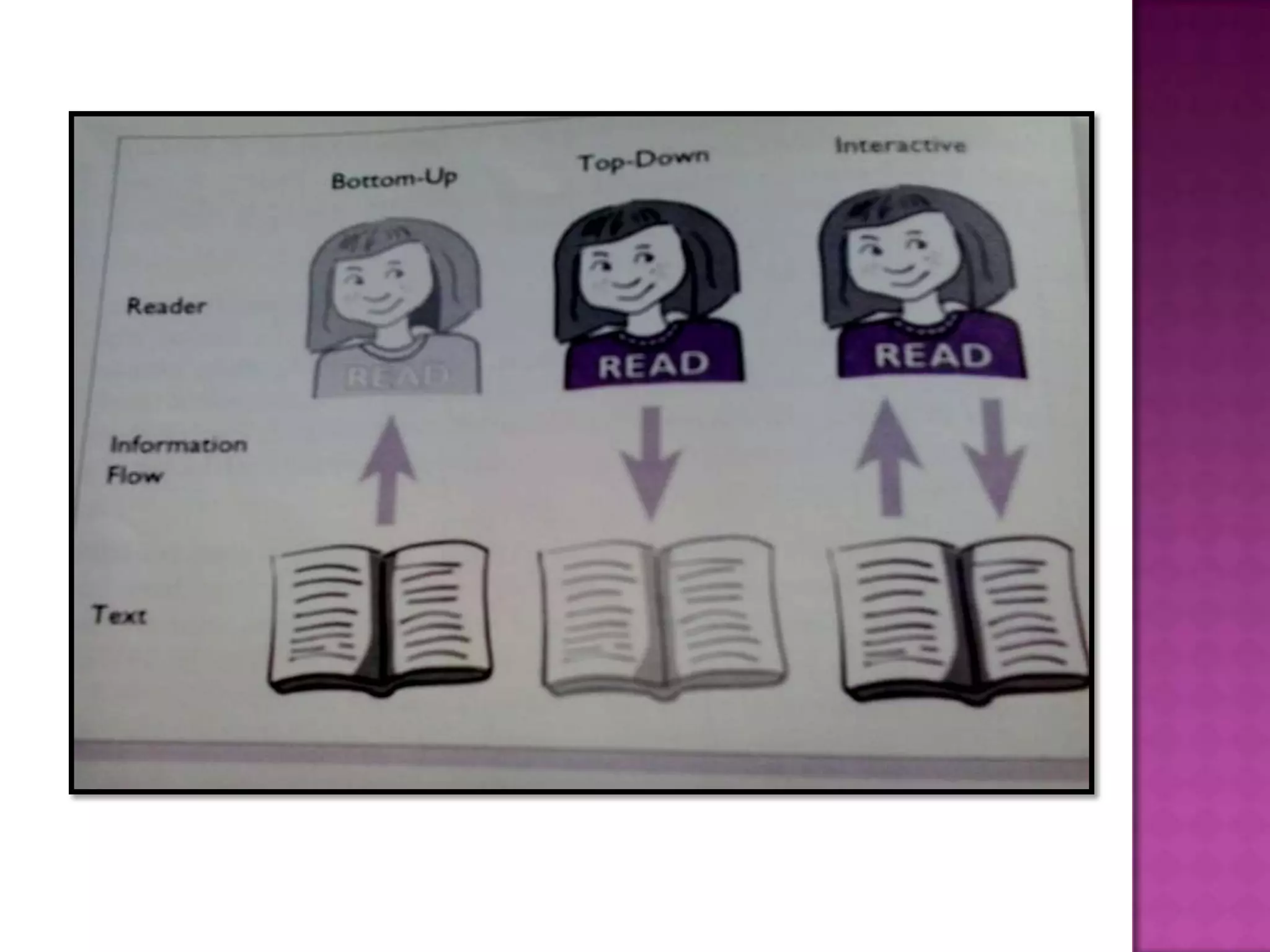 This document summarizes key concepts in reading instruction and literacy. It outlines 5 stages of reading development, approaches to reading like bottom-up and top-down, principles of effective reading instruction including strategy instruction, grouping students, and building positive attitudes. It emphasizes the importance of balanced instruction, consistent structure, appropriate texts, word study, independent reading, writing, small group sizes, and coordinating intervention with classroom instruction.