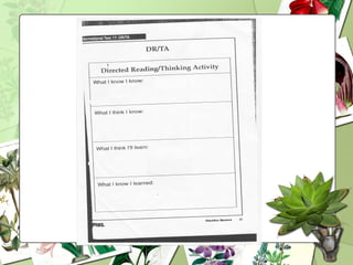 This document discusses strategies for effective reading instruction. It begins by outlining the stages of a typical reading lesson as pre-reading, while-reading, and post-reading. Several vocabulary development strategies are then described, including concept definition mapping, semantic feature analysis grids, and Frayer models. Comprehension strategies like directed reading-thinking activity, anticipation guides, story maps, and comparing/contrasting are also outlined. The document concludes by matching these strategies to the appropriate stages of reading instruction.