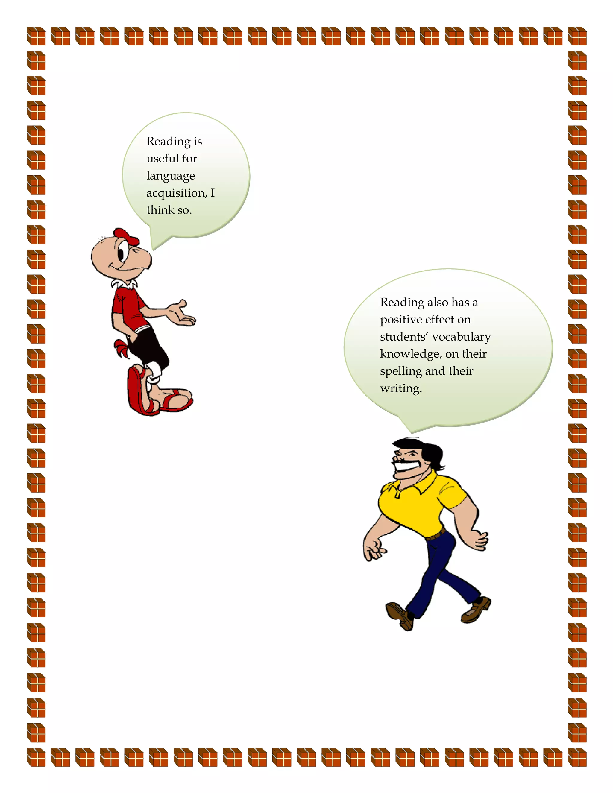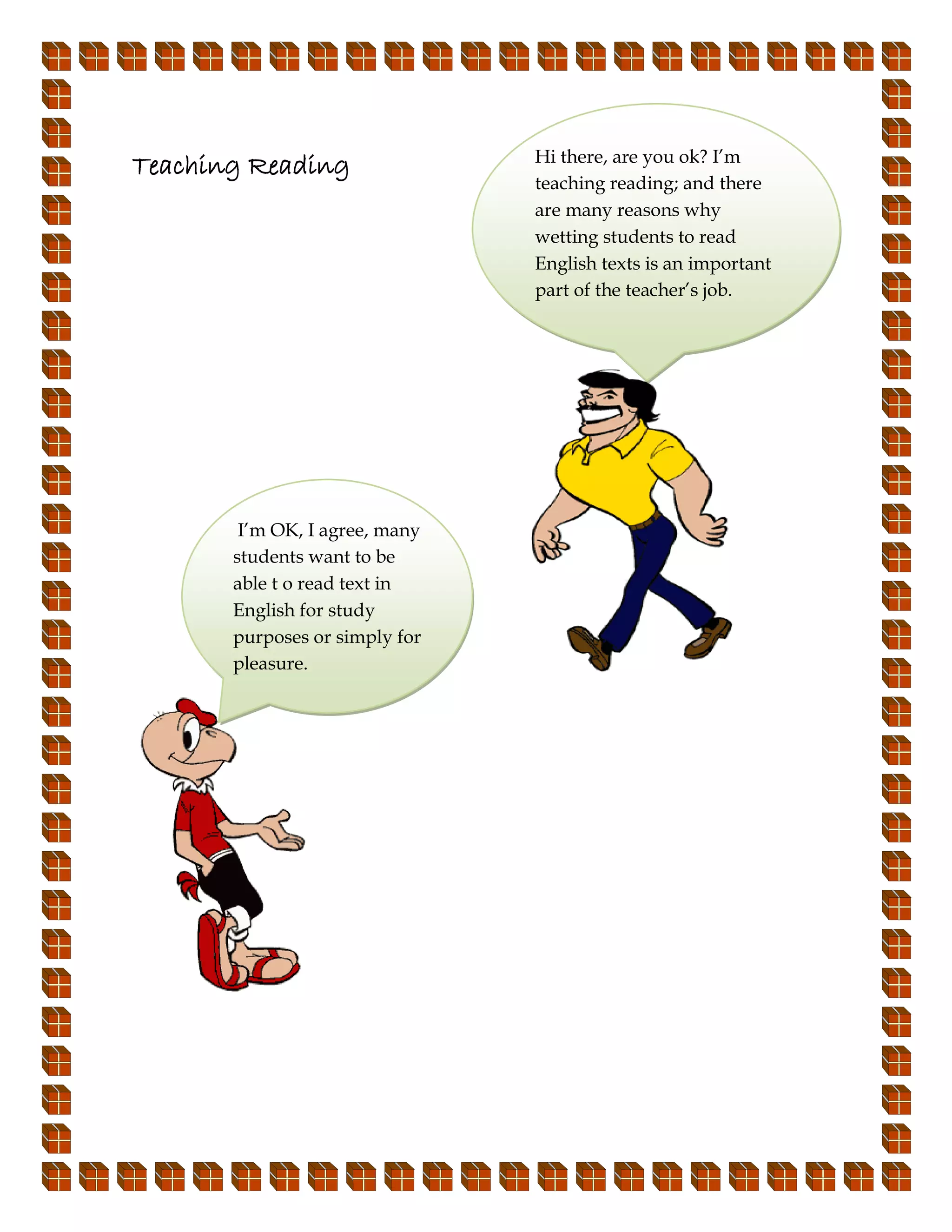 There are many benefits to teaching students to read English texts. Reading improves students' vocabulary, spelling, writing abilities, and language acquisition. It can introduce interesting topics that stimulate discussion and imagination. Teachers should encourage students to read often and discuss what they read to engage them and help them enjoy it. Various activities can bring texts to life, such as prediction, jigsaw reading, puzzles, and using newspapers.