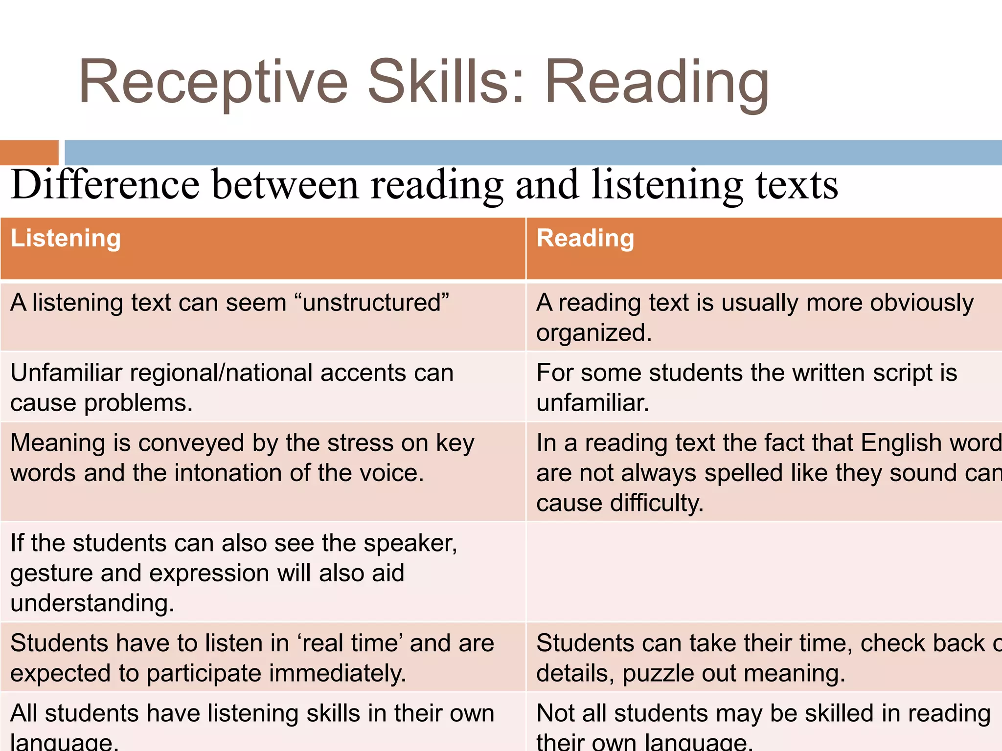 This document discusses receptive and productive language skills, specifically reading and speaking.