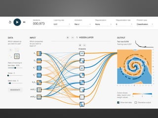 The document discusses teaching recurrent neural networks (RNNs) using TensorFlow, covering theory and practical examples such as learning sine waves, addition, and handwriting. It highlights the architecture for implementing RNNs, including initializing RNN cells and defining hyperparameters. Additionally, it mentions the use of R and Shiny for creating a visual interface to interact with TensorFlow models.