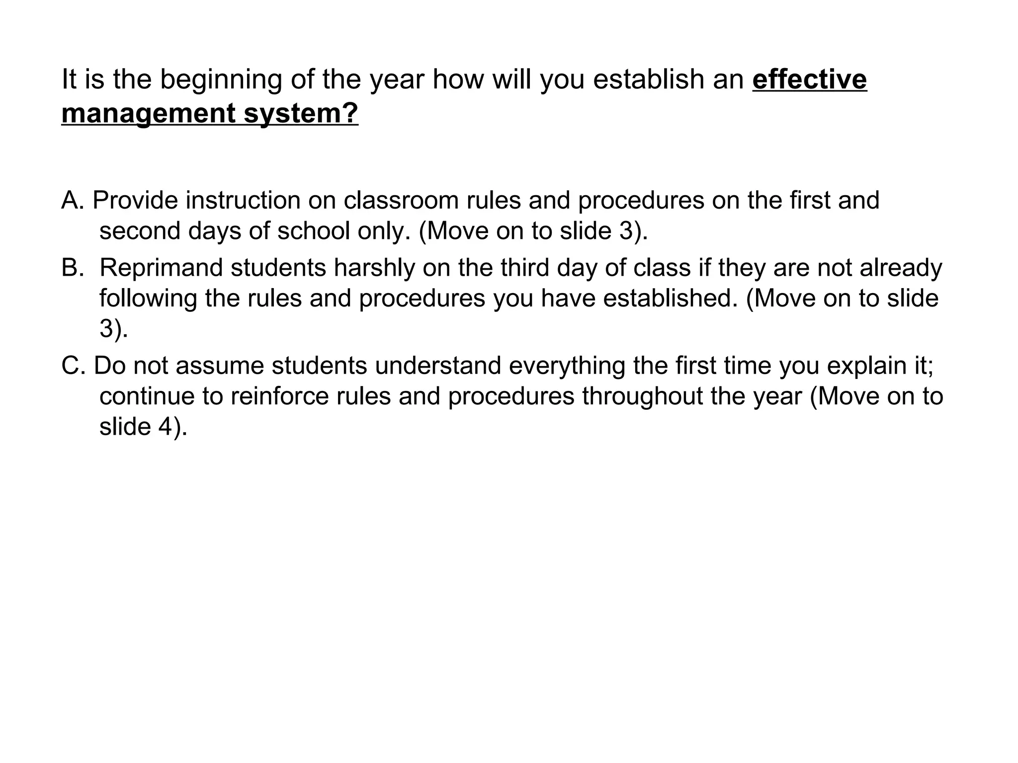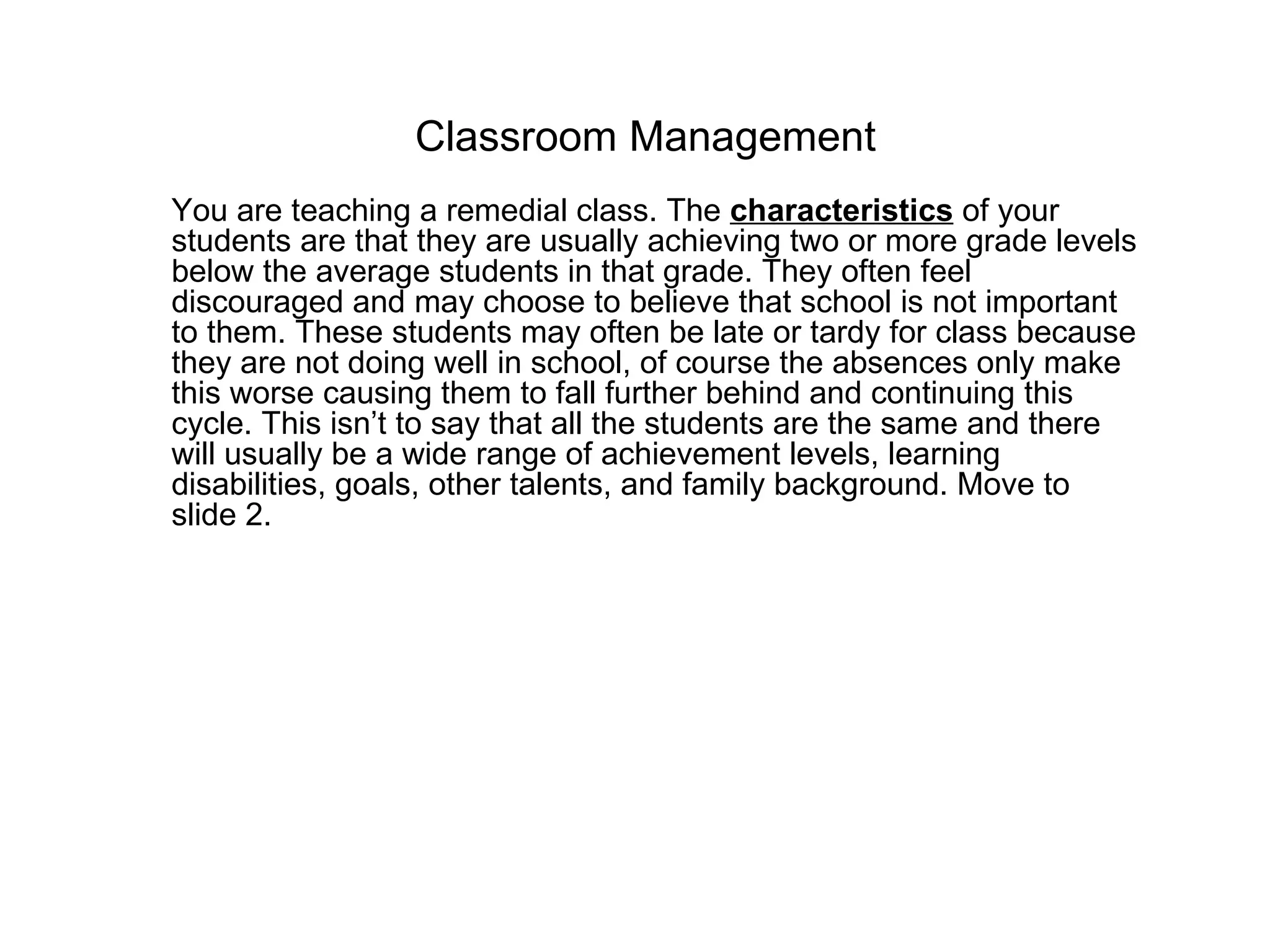 The document discusses strategies for managing a classroom of students achieving below grade level. It emphasizes the importance of continually reinforcing rules and procedures throughout the year to help struggling students succeed. Specific situations described include dealing with a disruptive student and preparing a student with autism for changes in routine. The best approaches focus on supporting students' individual needs through clear expectations, positive reinforcement, and addressing behaviors promptly and respectfully.