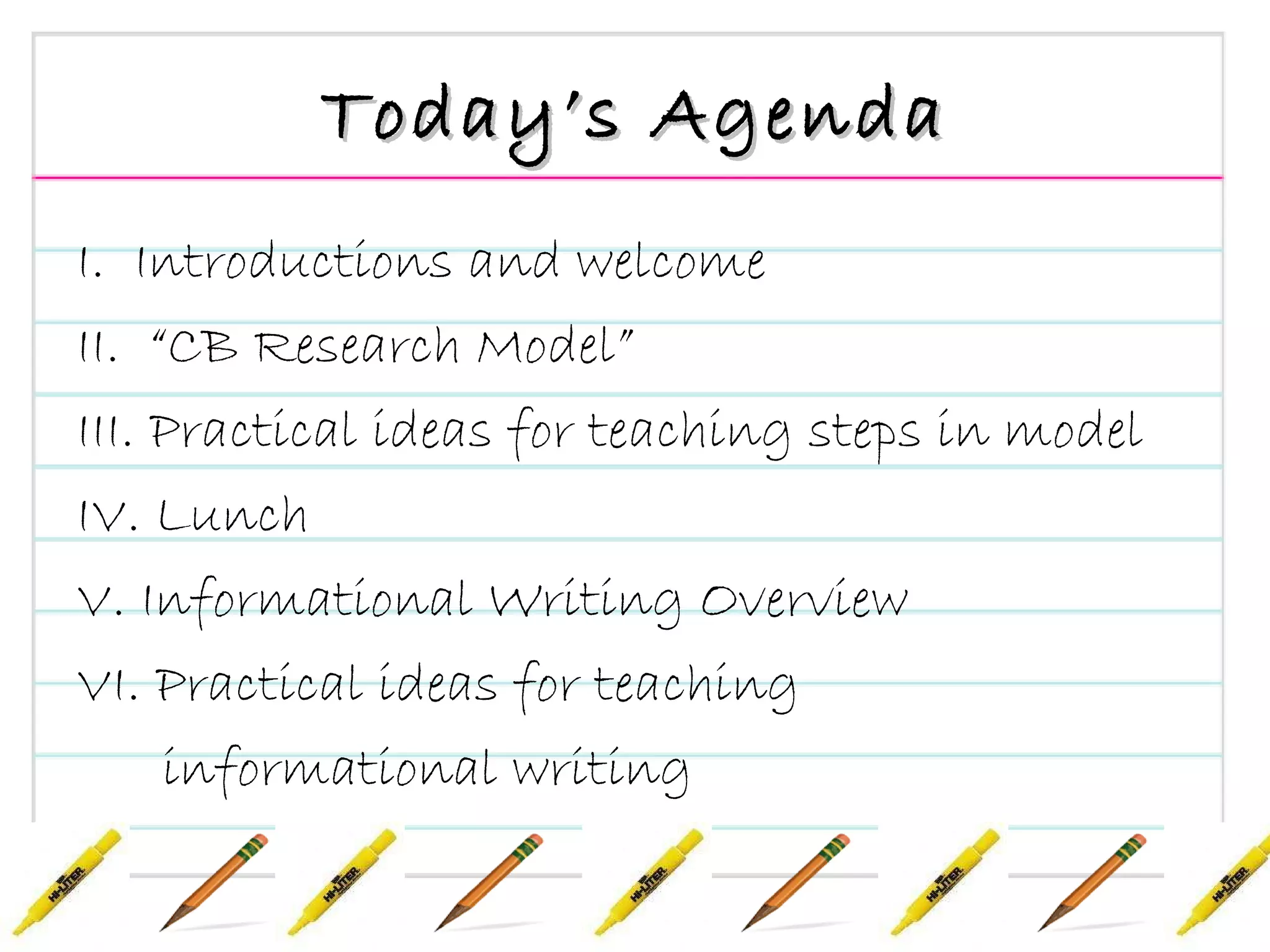 The document provides an overview of a presentation on teaching research and informational writing in elementary classrooms. It outlines a 10-step "CB Research Model" and discusses practical ideas and tools for teaching each step, including choosing topics, developing research questions, evaluating sources, taking notes, and organizing information.