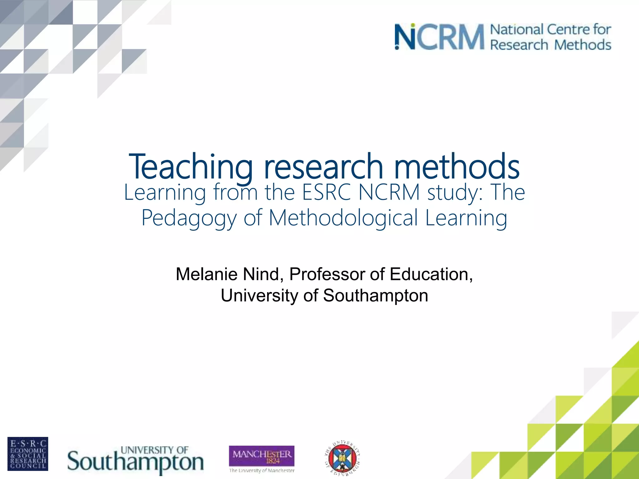 This document provides an overview of the Pedagogy of Methodological Learning study conducted by Melanie Nind and others to understand how advanced social research methods are taught. The study used multiple methods, including interviews and discussions with an expert panel of methods teachers, focus groups with both university and social research organization teachers, video stimulated reflection and dialogue with teachers and learners, a methods learning diary circle, and case studies. The goal was to generate substantial data on research methods pedagogy and provide resources for methods teachers beyond relying solely on trial and error, including papers, guides, and videos summarizing the findings.
