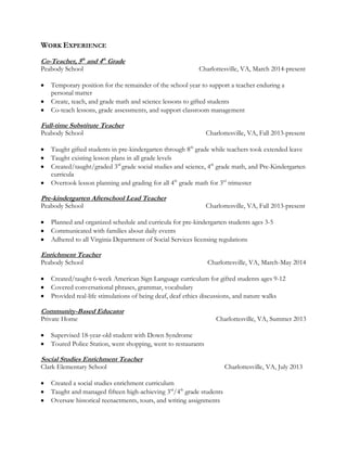 Colleen McGillicuddy is seeking an elementary teaching position, preferably in ESOL or Spanish Immersion. She has over 10 years of experience teaching various grades and subjects in both public and private schools. She is fluent in Spanish and American Sign Language. She has a bachelor's degree in elementary education and Spanish from Northern Arizona University and is certified to teach in Virginia and Arizona.
