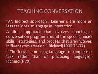 The document discusses various techniques for teaching speaking skills, including both direct and indirect approaches. It emphasizes using tasks that focus on meaningful communication over language practice. Specific techniques mentioned include conversation practice, transactional activities like ordering from a catalog, and individual oral dialogue journals. Principles for designing speaking techniques include using a variety that cover accuracy and fluency, providing meaningful contexts, feedback, and opportunities for student initiation of oral communication. The document also discusses teaching pronunciation and considerations around error correction.