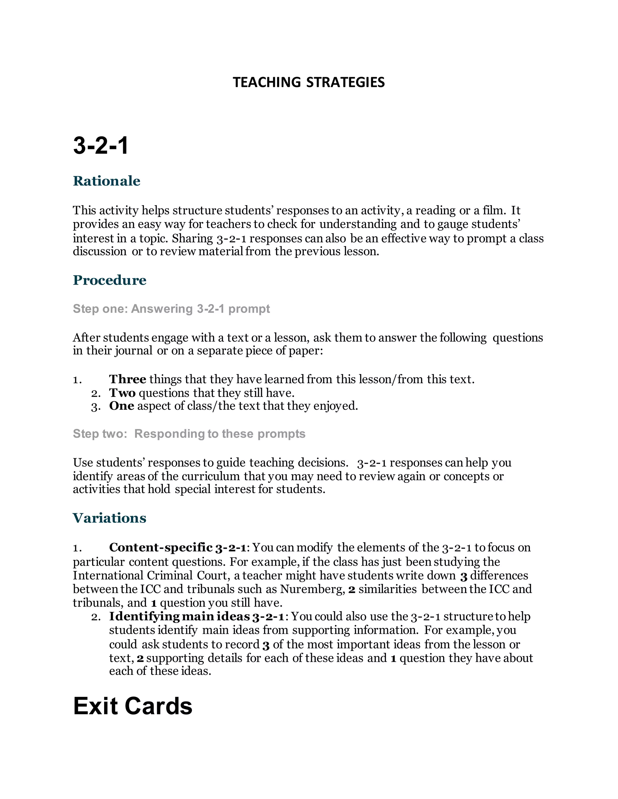 This document discusses two teaching strategies: 3-2-1 and exit cards.