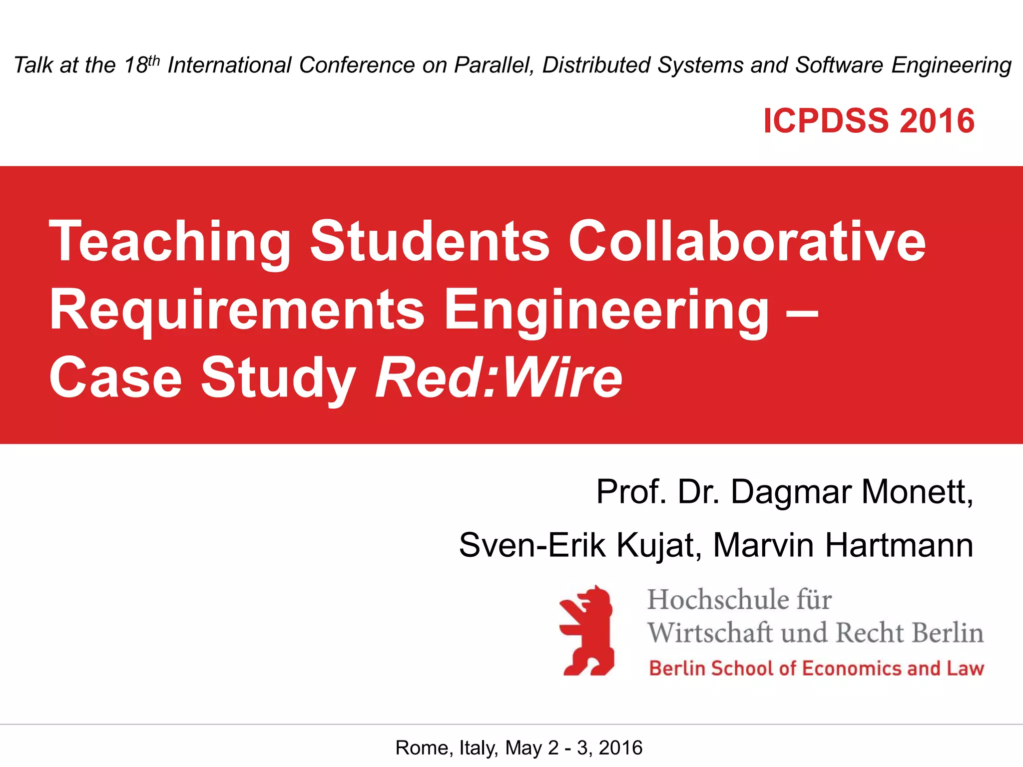 The document discusses a case study on a collaborative requirements engineering tool, red:wire, presented by Prof. Dr. Dagmar Monett at the 18th International Conference on Parallel, Distributed Systems and Software Engineering. It outlines a structured approach to requirements development, teaches students to effectively manage and document software requirements, and evaluates the learnability and effectiveness of red:wire through pre- and post-surveys. The findings indicate that students felt they improved their requirements engineering skills, but further development and testing of the tool are necessary.