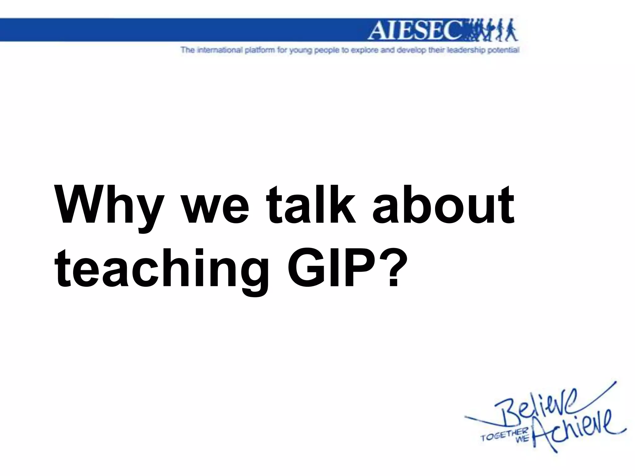 1. The document discusses the Teaching Global Internship Program (GIP) offered by AIESEC, which provides cross-cultural professional development experiences in teaching.