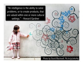 The document discusses the concept of multiple intelligences as developed by Howard Gardner, emphasizing that everyone possesses various types of intelligences and that learning experiences can be enriched by tapping into all these areas. It provides resources and web tools for assessing and adapting learning environments to cater to diverse intelligences, promoting strategies like project-based learning and choice-driven activities. Additionally, it highlights suggested tools for creating multimedia educational content.