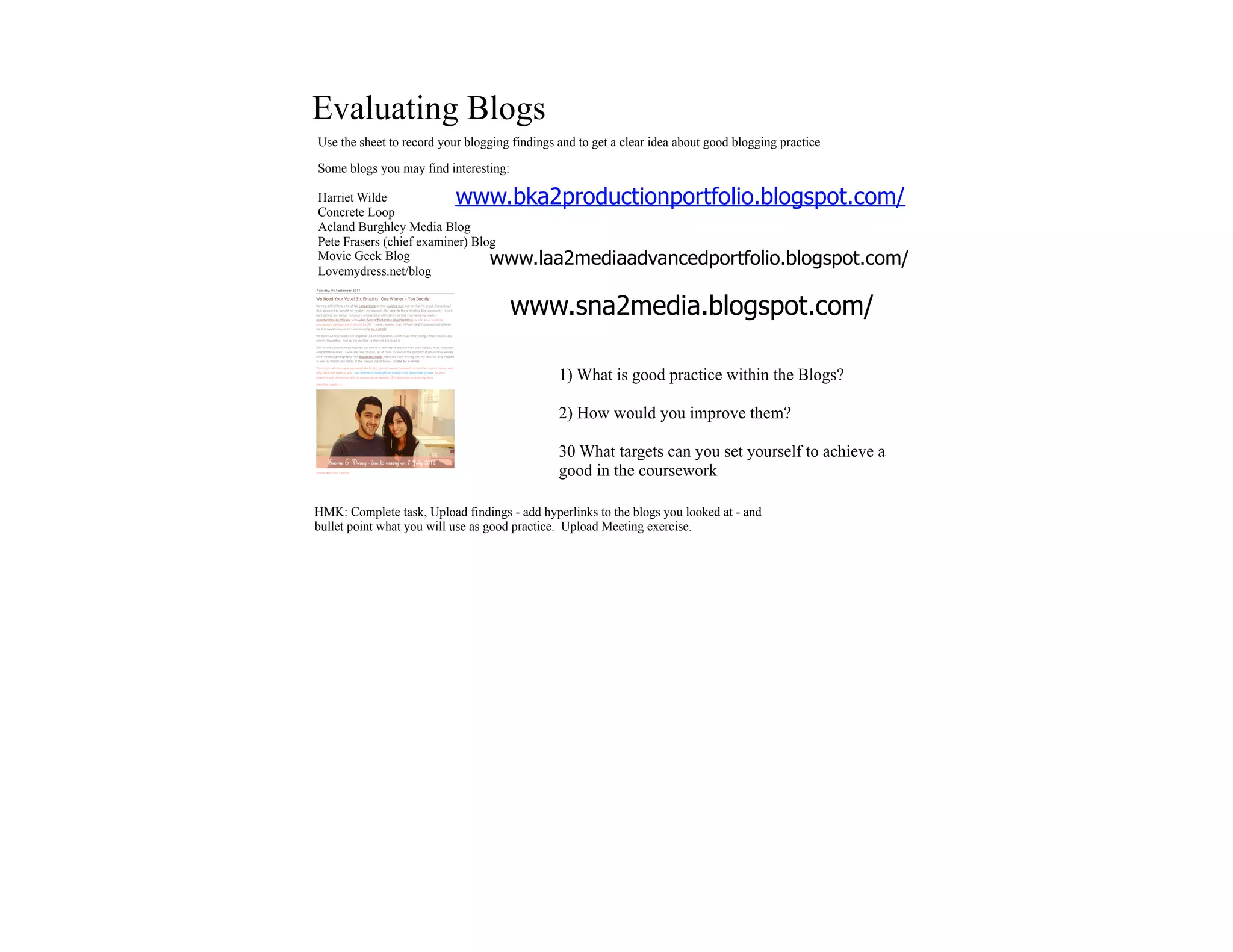 The document provides guidance for evaluating different horror film blogs and setting targets for good blogging practice. It lists some horror blogs that may be interesting to review. The reviewer is asked to consider what constitutes good blogging practice, how the listed blogs could be improved, and what targets they could set themselves to achieve a good blog for a coursework assignment. The reviewer is instructed to complete the task, upload their findings with hyperlinks to the blogs reviewed, and bullet point what practices they will use. They are also to upload a meeting exercise.