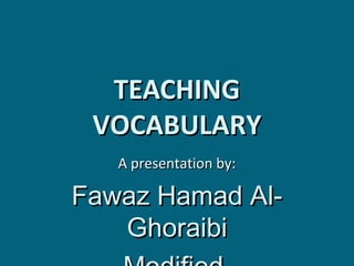This document discusses techniques for teaching vocabulary. It begins by outlining the objectives of teaching new vocabulary and establishing its importance. Some key techniques presented include saying and writing the word clearly, translating it, providing examples of usage, visual aids like pictures and gestures, guessing meanings from context, and asking questions that incorporate the new word. The document emphasizes combining multiple techniques and expanding vocabulary through related words. It also suggests some games to reinforce learning like fill-in-the-blank, puzzles, and flashcards.
