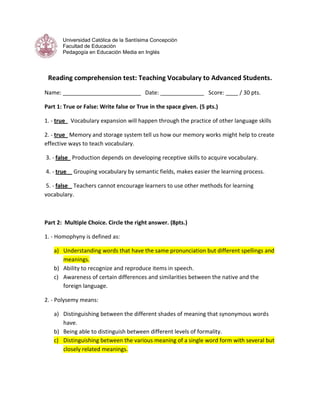 1. The document is a reading comprehension test about teaching vocabulary to advanced students. It contains multiple choice questions and fill-in-the-blank questions about vocabulary acquisition and teaching methods.