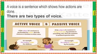The document discusses the passive voice in English grammar. There are two types of passive voice: active and passive. To change a sentence from active to passive voice, the object of the active sentence becomes the subject of the passive sentence, a form of the verb "to be" is used along with the past participle of the main verb, and the original subject becomes an optional prepositional phrase introduced with "by". Several examples are provided to illustrate how to transform sentences between active and passive voice.