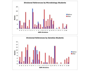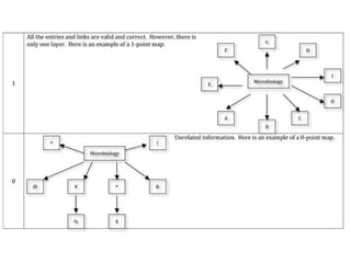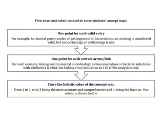 The document discusses the use of concept maps in teaching microbiology, focusing on enhancing student understanding and engagement through structured activities. It outlines a learning activity that includes creating individual concept maps and surveys, assessing knowledge before and after the activity. The results showed significant improvement in students' ability to identify sub-disciplines and topics in microbiology.