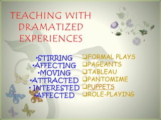 This document discusses using dramatized experiences like plays, pageants, puppetry, and role-playing to engage students. It focuses on the use of puppets, which have been used for thousands of years in cultures around the world and come in many forms, including shadow, rod, hand, glove-and-finger, and marionette puppets. Each type has distinct characteristics in terms of their construction and how they are operated. Puppets can help convey character, emotion, and tell stories to students.