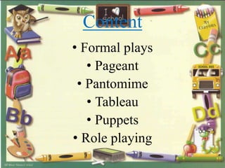 This document discusses different methods for using dramatization in teaching, including formal plays, pageants, pantomimes, tableaus, puppets, and role playing. It provides descriptions of each method, such as pageants typically depicting local history and pantomimes conveying a story through body movements alone. The document also covers different types of puppets like shadow, rod, hand, glove-and-finger, and marionette puppets. Overall, the document outlines dramatization techniques that can be used to engage both participants and spectators in communicating and sharing ideas.