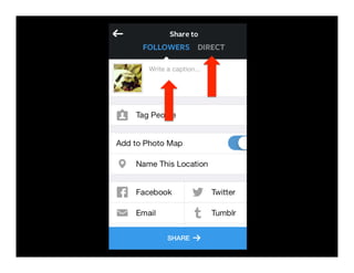 This document provides suggestions for using Instagram in education. It outlines features of Instagram like image uploads, filters, hashtags, and 15 second videos. It then gives recommendations for setting up a class Instagram account, creating a hashtag, allowing students to submit photo or video assignments, doing image-based writing prompts, scavenger hunts, story chains, recreating scenes, and making 15 second movie trailers. The goal is to engage students and get them involved in learning through using Instagram.
