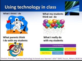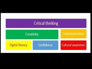 The document discusses the transformative role of technology in education, emphasizing a shift from traditional teaching to engaging and collaborative learning methods. It highlights the importance of digital citizenship, critical thinking, and adaptability, asserting that educators must continuously learn to guide students in a technology-driven world. Notable figures like Sugata Mitra and Ken Robinson are referenced, advocating for innovative educational practices that prepare students for future challenges.
