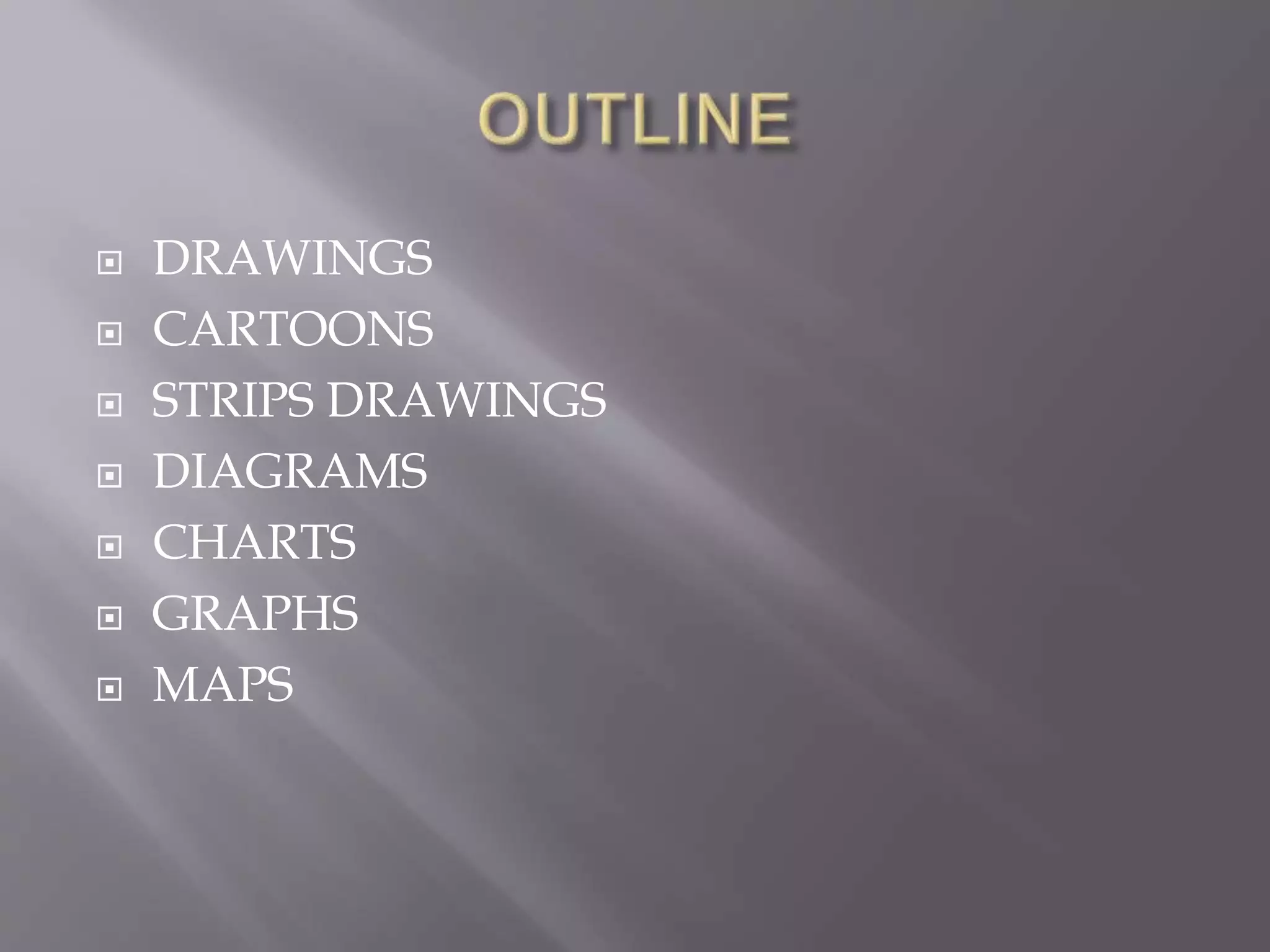 This document discusses various types of visual aids that can be used when teaching, including drawings, cartoons, diagrams, charts, graphs, and maps. It provides examples of different kinds of diagrams like affinity diagrams, fishbone diagrams, flow charts, organizational charts, and more. It also discusses different types of graphs like pie graphs, bar graphs, and pictorial graphs. Finally, it mentions different kinds of maps such as physical maps, relief maps, and political maps. The overall document serves as a reference for different visual representation tools that can be used to enhance teaching.