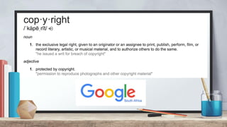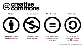 The workshop presented by Rondine Carstens focuses on the importance of visuals in teaching and the implications of copyright in using images. It discusses Creative Commons licensing, various resources for free images, and emphasizes the benefits of visual aids for enhancing student motivation and learning retention. The document also explores practical applications of visuals, including infographics, video, and interactive content, alongside tools for creating these resources.