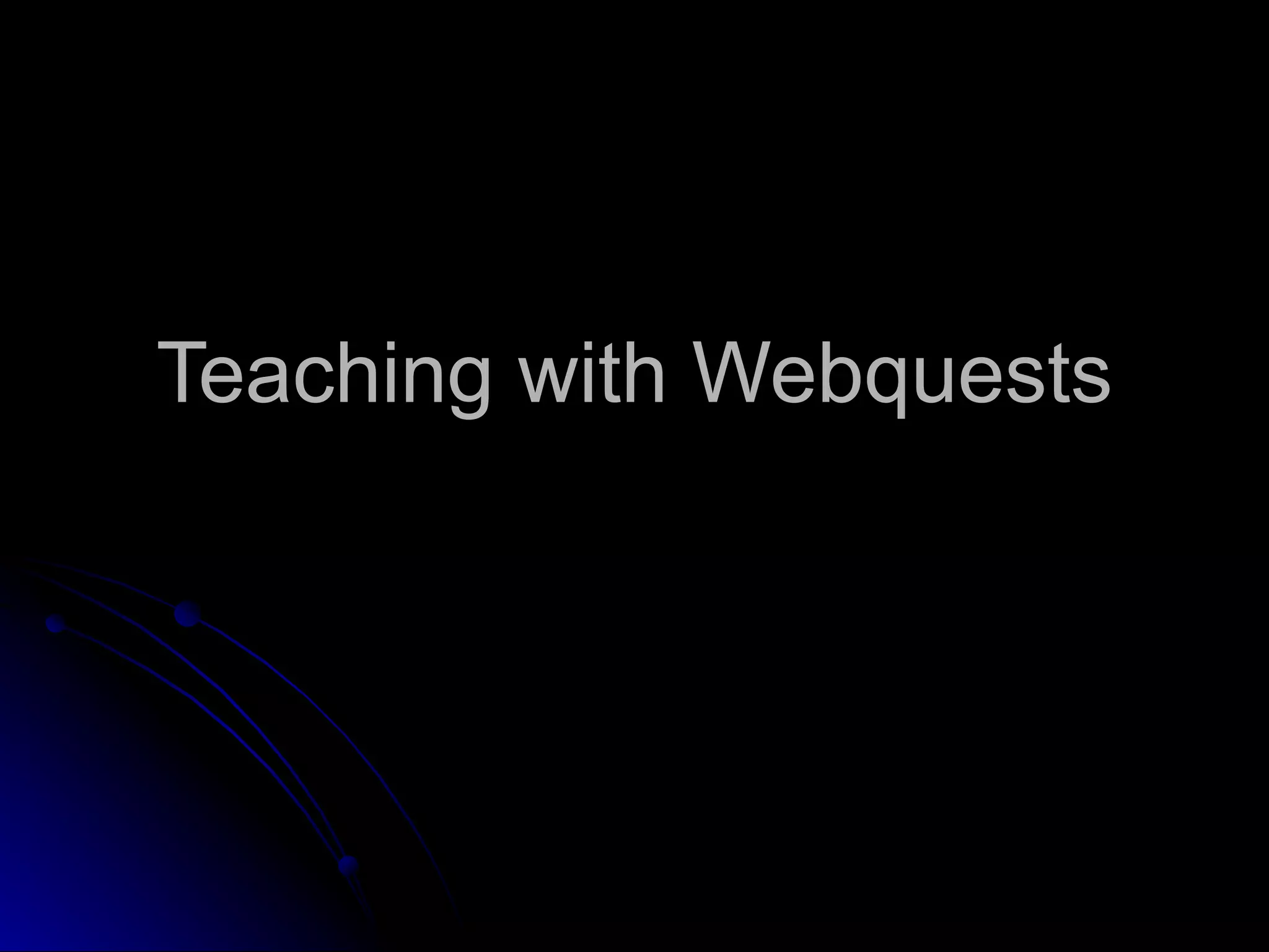 A webquest is an assignment that asks students to use the internet to learn about and synthesize knowledge on a specific topic. An effective webquest requires students to accomplish a task, such as solving a hypothetical problem, to demonstrate their understanding. Webquests make learning engaging by allowing students to discover information themselves from curated websites. They also allow students to work at their own pace individually or in groups. Well-designed webquests provide authentic learning experiences by posing real-world problems for students to address through research. Elements of an effective webquest include an introduction, task, process, resources, evaluation, and conclusion.