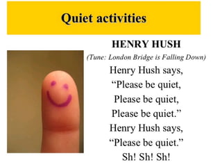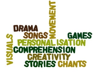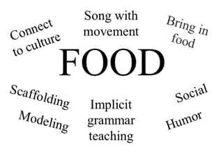 This document discusses principles and strategies for teaching young English language learners. It explains that young children acquire language naturally through social interaction and play. Effective teaching strategies include using routines, scaffolding, and making lessons fun, meaningful, and supported. Teachers should draw on theories from Piaget, Vygotsky and Bruner to create interactive lessons that build on children's innate language learning abilities.