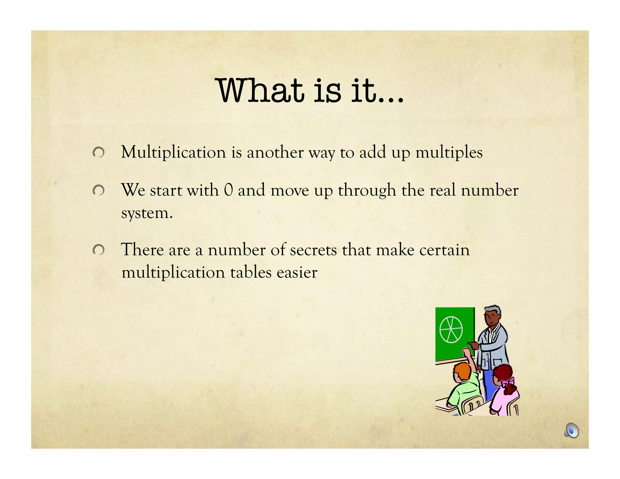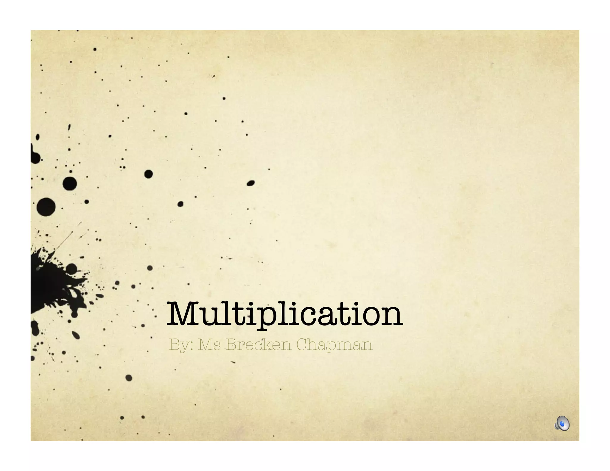 Multiplication is a way to add up multiples. It involves doubling, adding numbers to themselves, and counting by various increments like 5s and 10s. Mastering multiplication tables requires practice with timed tests and relating numbers to real world examples. Continued practice is important to learn multiplication facts.