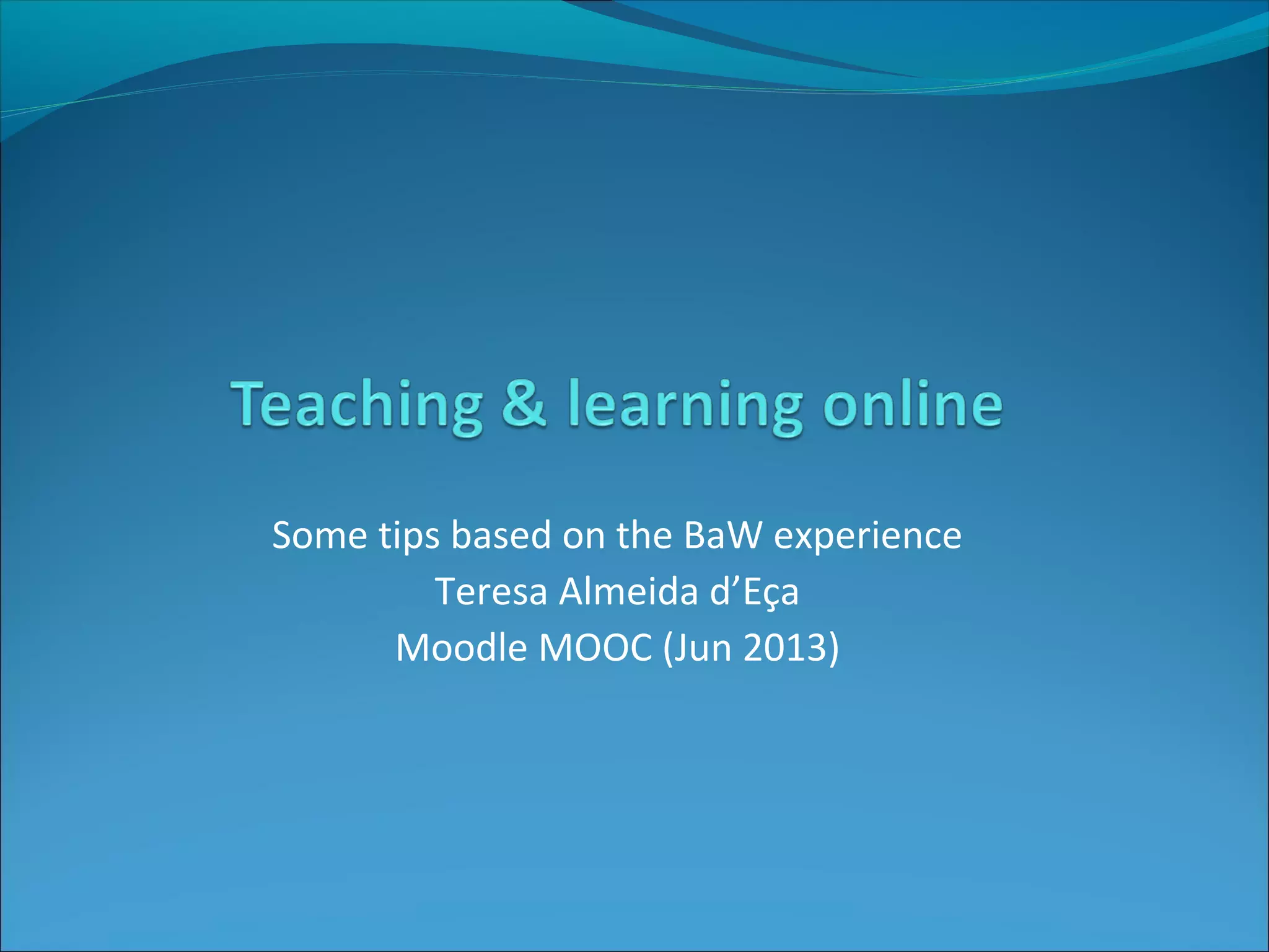 This document provides tips and recommendations for organizing and facilitating online workshops based on a 10-year experience running the Becoming a Webhead workshop. Key recommendations include: starting planning weeks in advance; having a team of coordinators and moderators with clearly defined roles; providing clear instructions and content; offering both synchronous activities like webinars and asynchronous activities like discussions on a wiki; and emphasizing community-building through communication tools. While time-consuming, the workshops advantage include flexible, self-paced, hands-on learning and forming connections with an international community of peers.